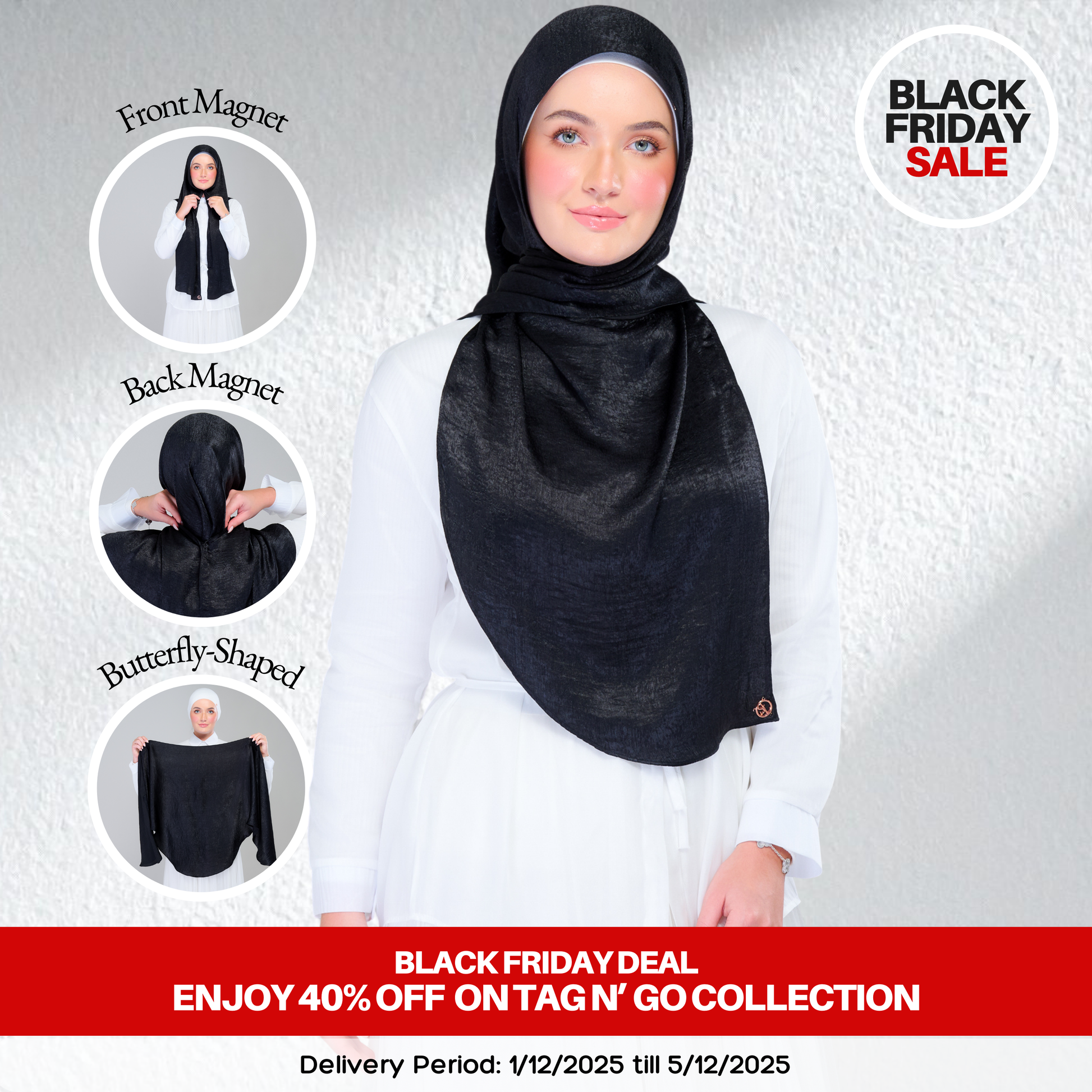 #GoPinless. Save your time for something better and Get Ready in Seconds with our Tag n' Go Collection. Your Favourite Shawl but better! Both Pairs of Magnets are adjustable to your face and body size for Elegant Styling.