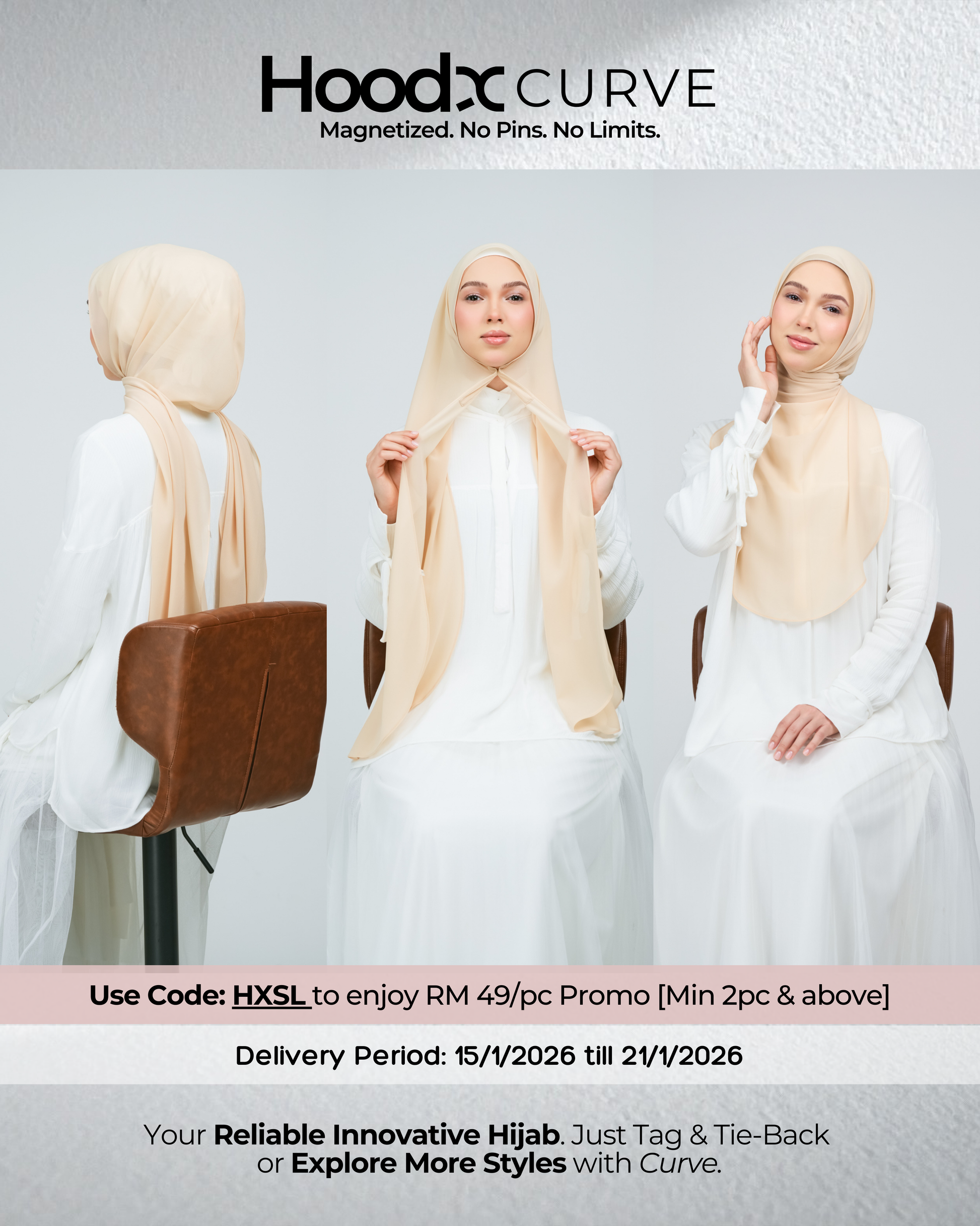 Introducing the HoodX Curve in our signature Pearl Chiffon — a redefined silhouette made for women who want a naturally draped, face-framing flow with zero effort.