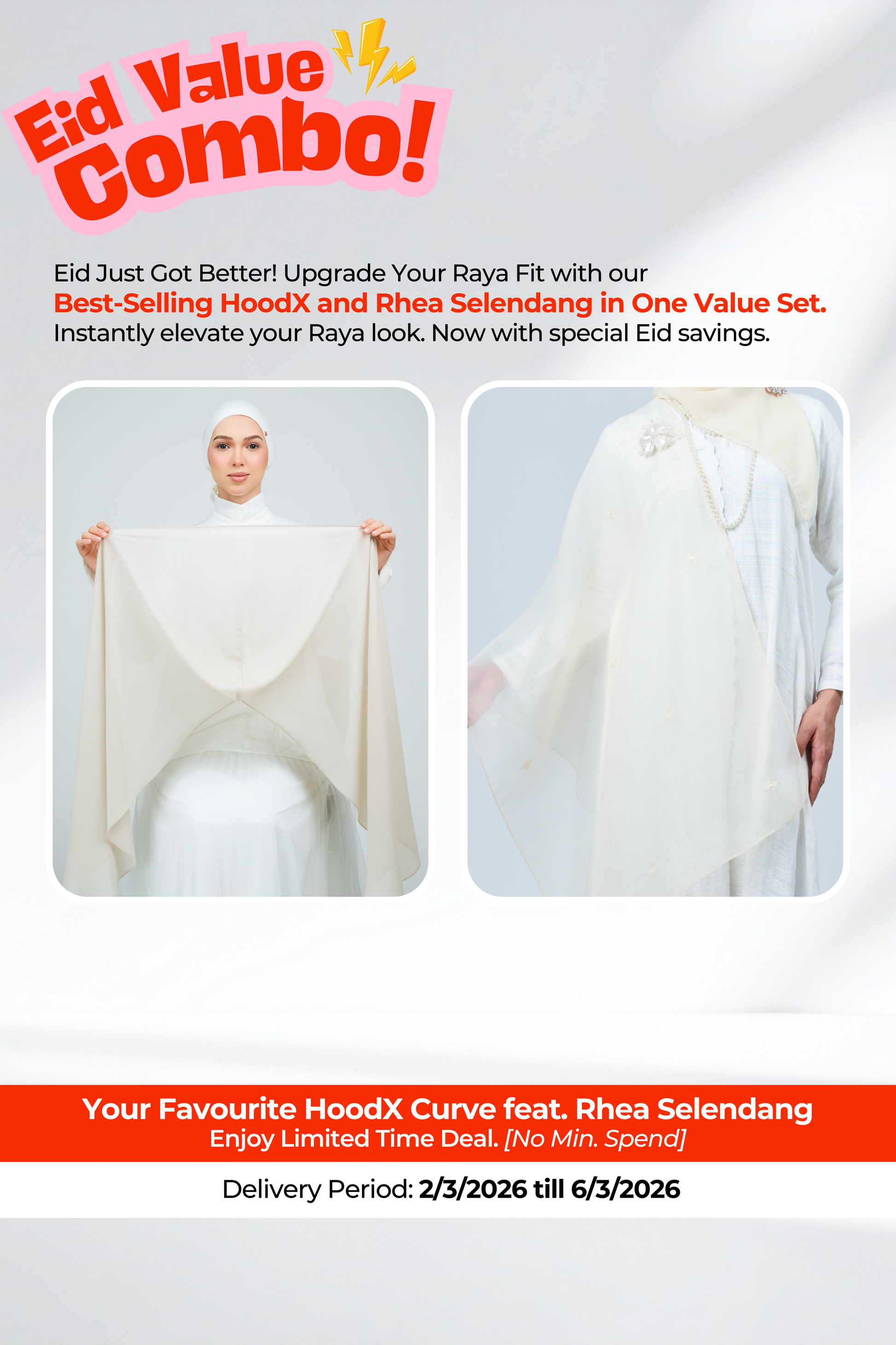 Upgrade your kurung effortlessly with the HoodXCurve x Rhea Selendang Value Combo. The perfect pairing designed to give you a complete Raya look with less effort and more savings.