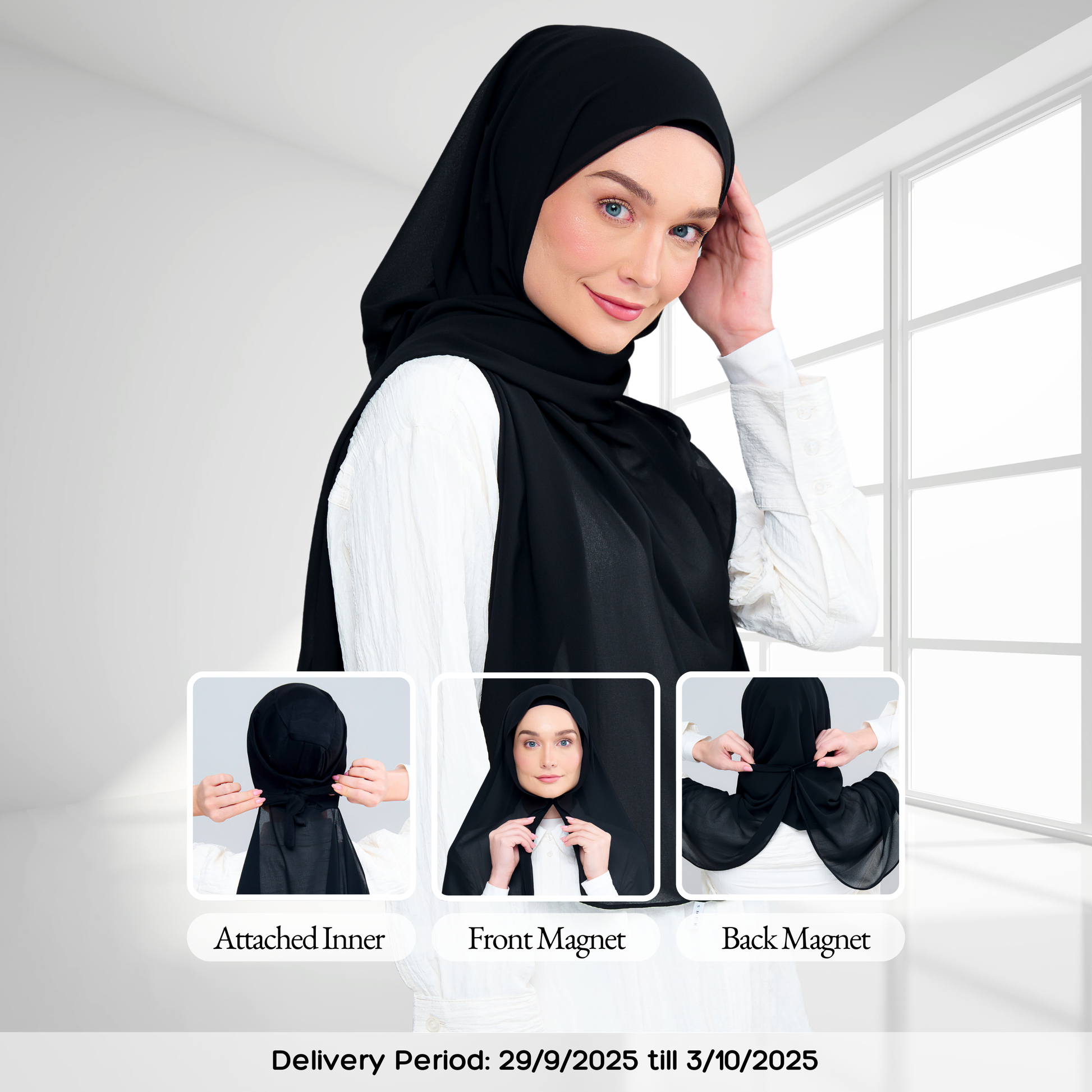 3IN1 Faith features an attached inner to a Full-Curve 1.8 Metre Pearl Chiffon Shawl with Sewn in Front & Back Magnet.