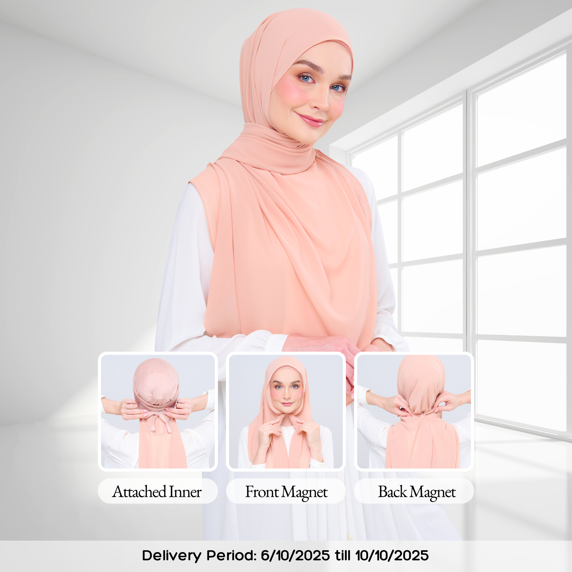 3IN1 Faith features an attached inner to a Full-Curve 1.8 Metre Pearl Chiffon Shawl with Sewn in Front & Back Magnet.