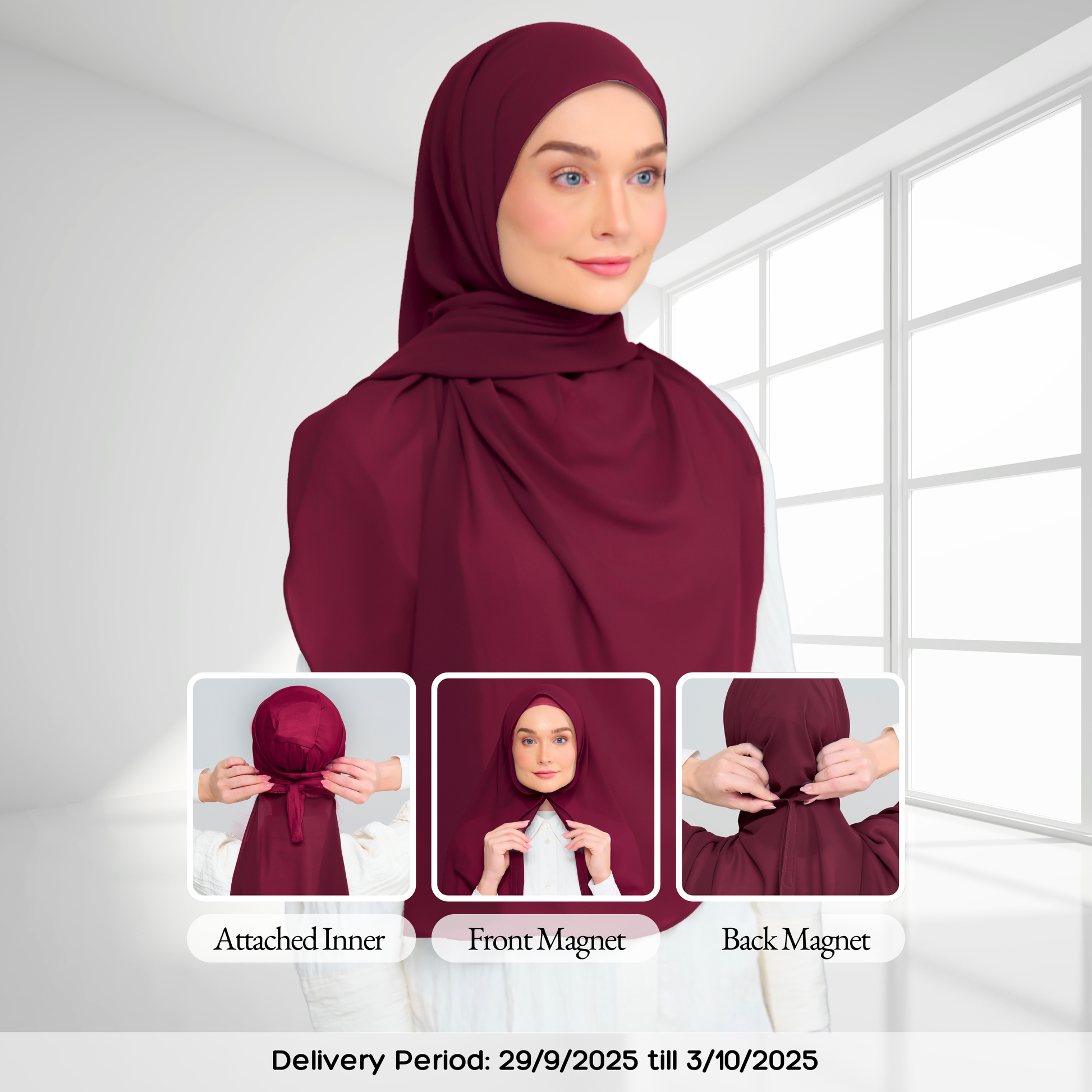 3IN1 Faith features an attached inner to a Full-Curve 1.8 Metre Pearl Chiffon Shawl with Sewn in Front & Back Magnet.