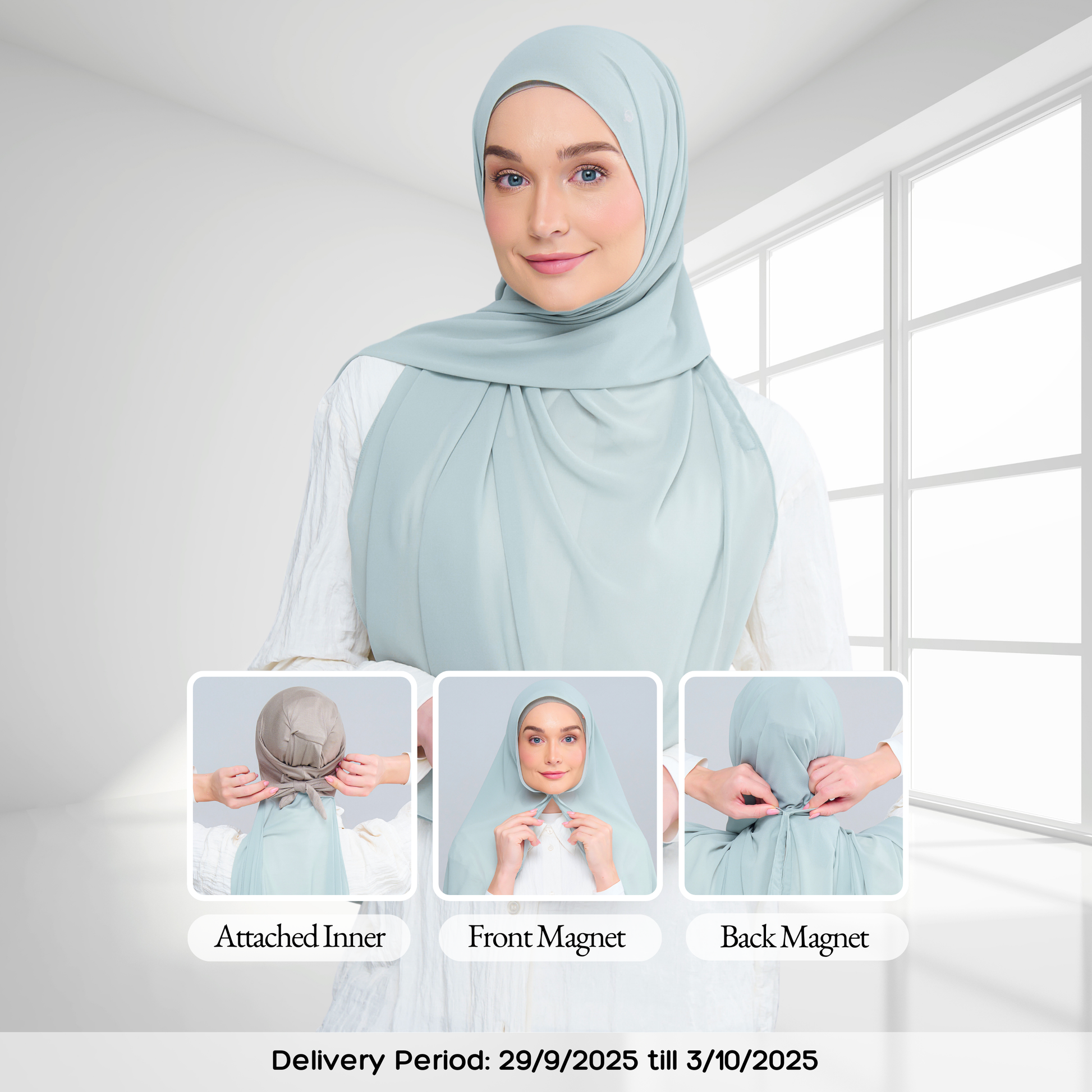 3IN1 Faith features an attached inner to a Full-Curve 1.8 Metre Pearl Chiffon Shawl with Sewn in Front & Back Magnet.