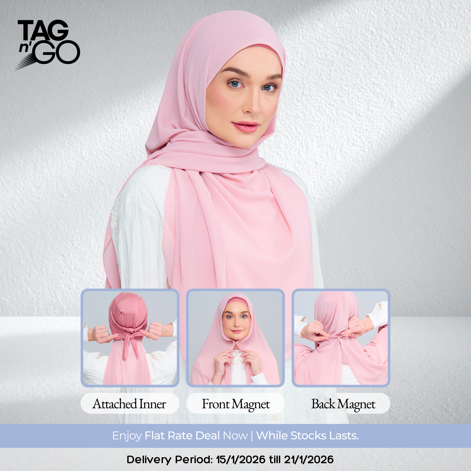3IN1 Faith features an attached inner to a Full-Curve 1.8 Metre Pearl Chiffon Shawl with Sewn in Front & Back Magnet.
