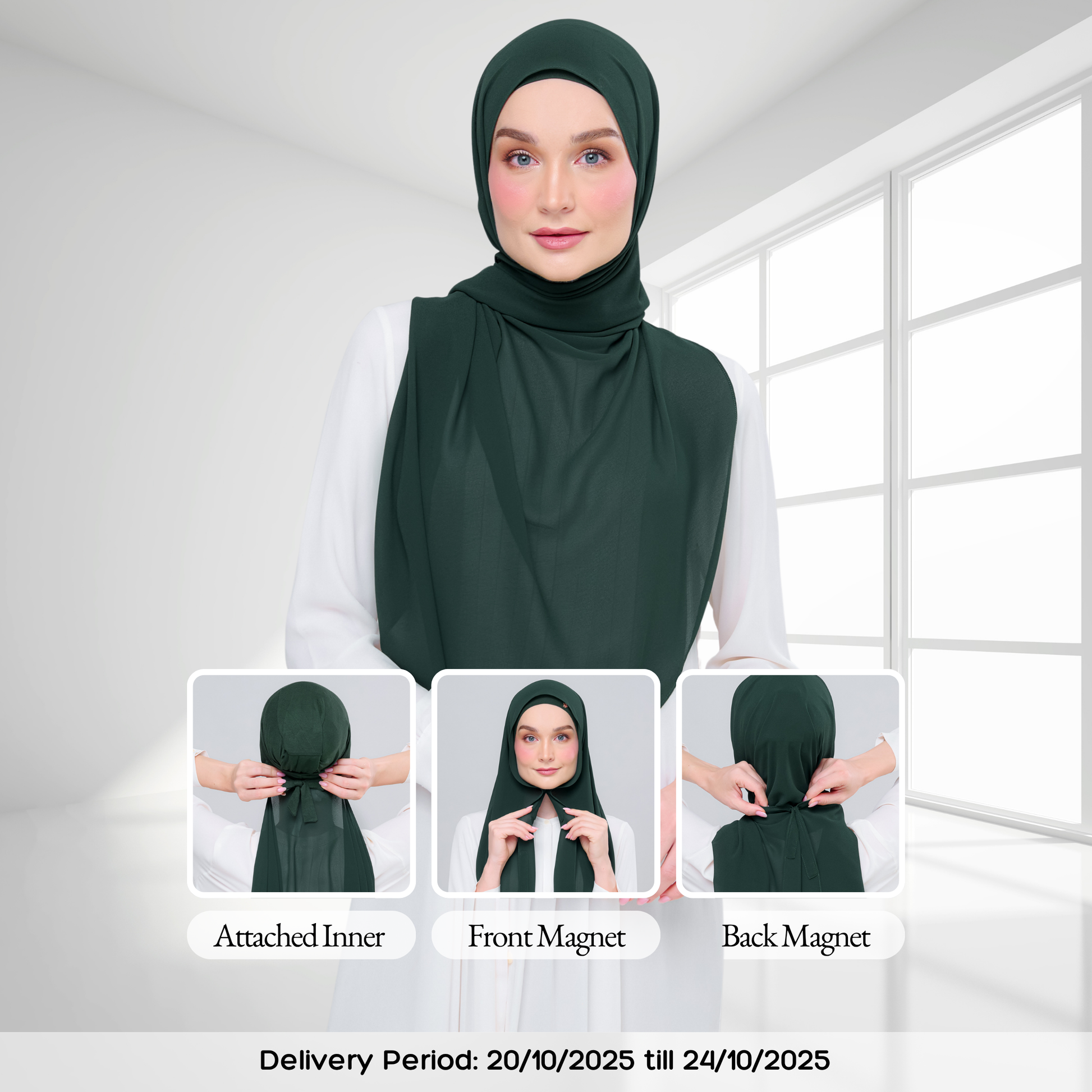 3IN1 Faith features an attached inner to a Full-Curve 1.8 Metre Pearl Chiffon Shawl with Sewn in Front & Back Magnet.