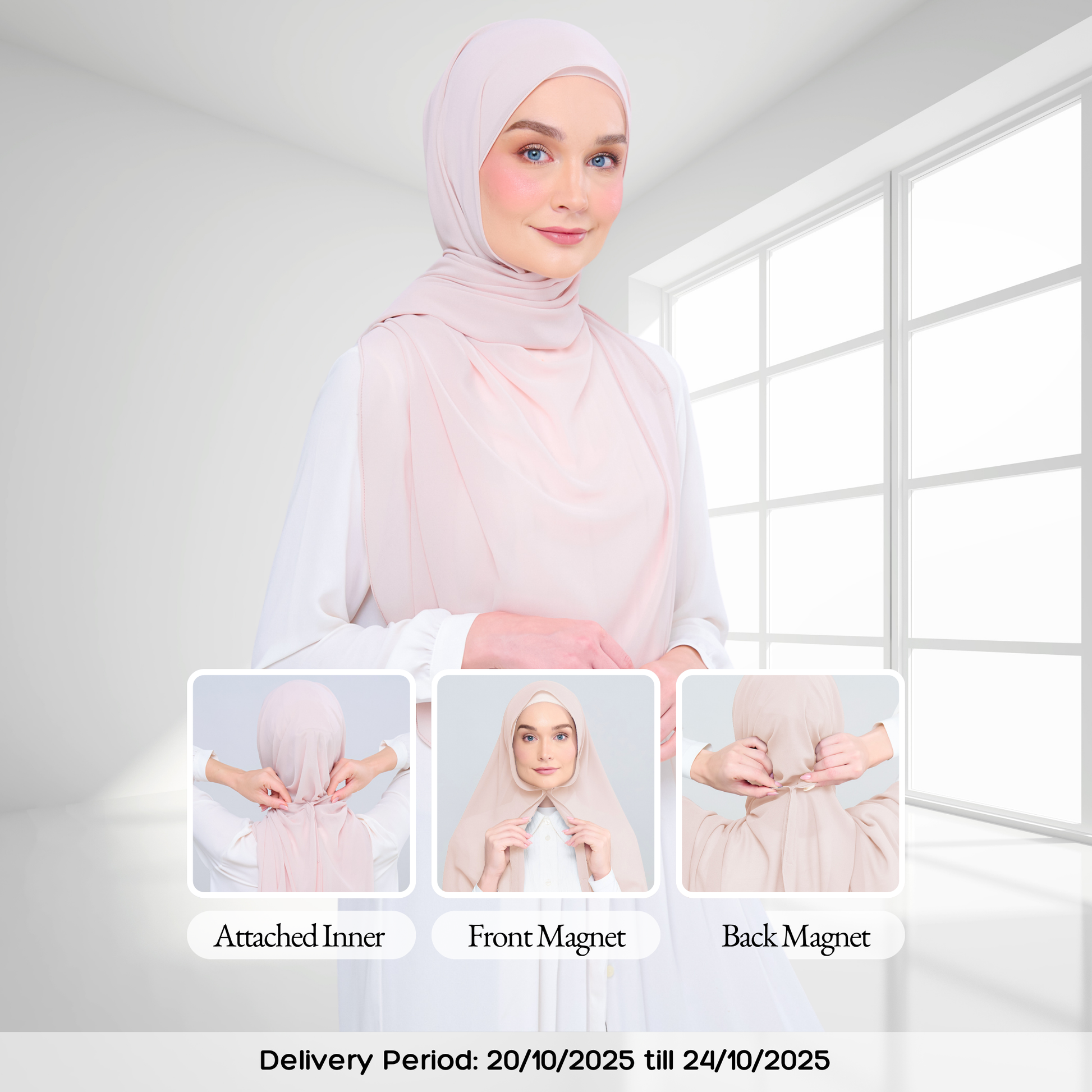 3IN1 Faith features an attached inner to a Full-Curve 1.8 Metre Pearl Chiffon Shawl with Sewn in Front & Back Magnet.