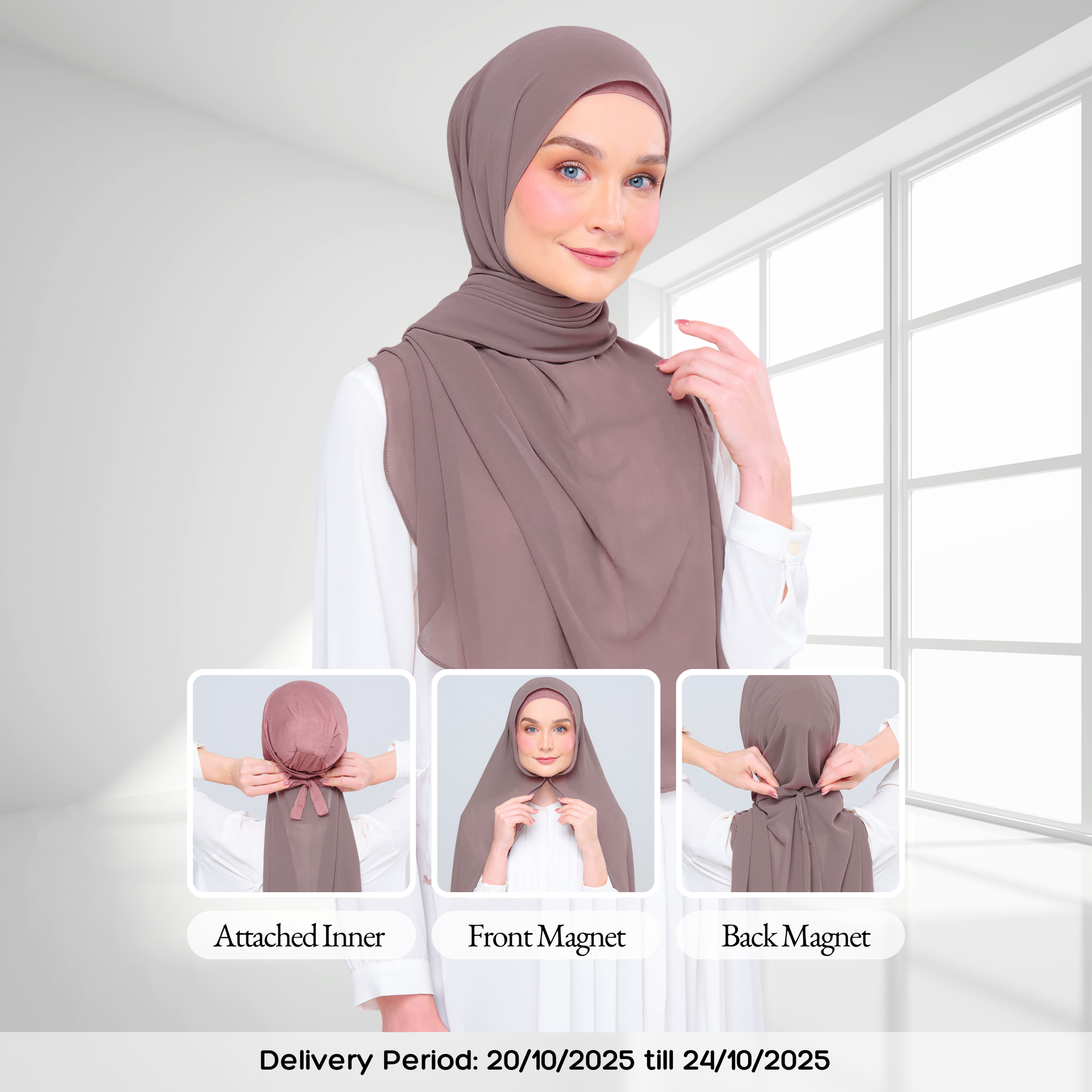 3IN1 Faith features an attached inner to a Full-Curve 1.8 Metre Pearl Chiffon Shawl with Sewn in Front & Back Magnet.