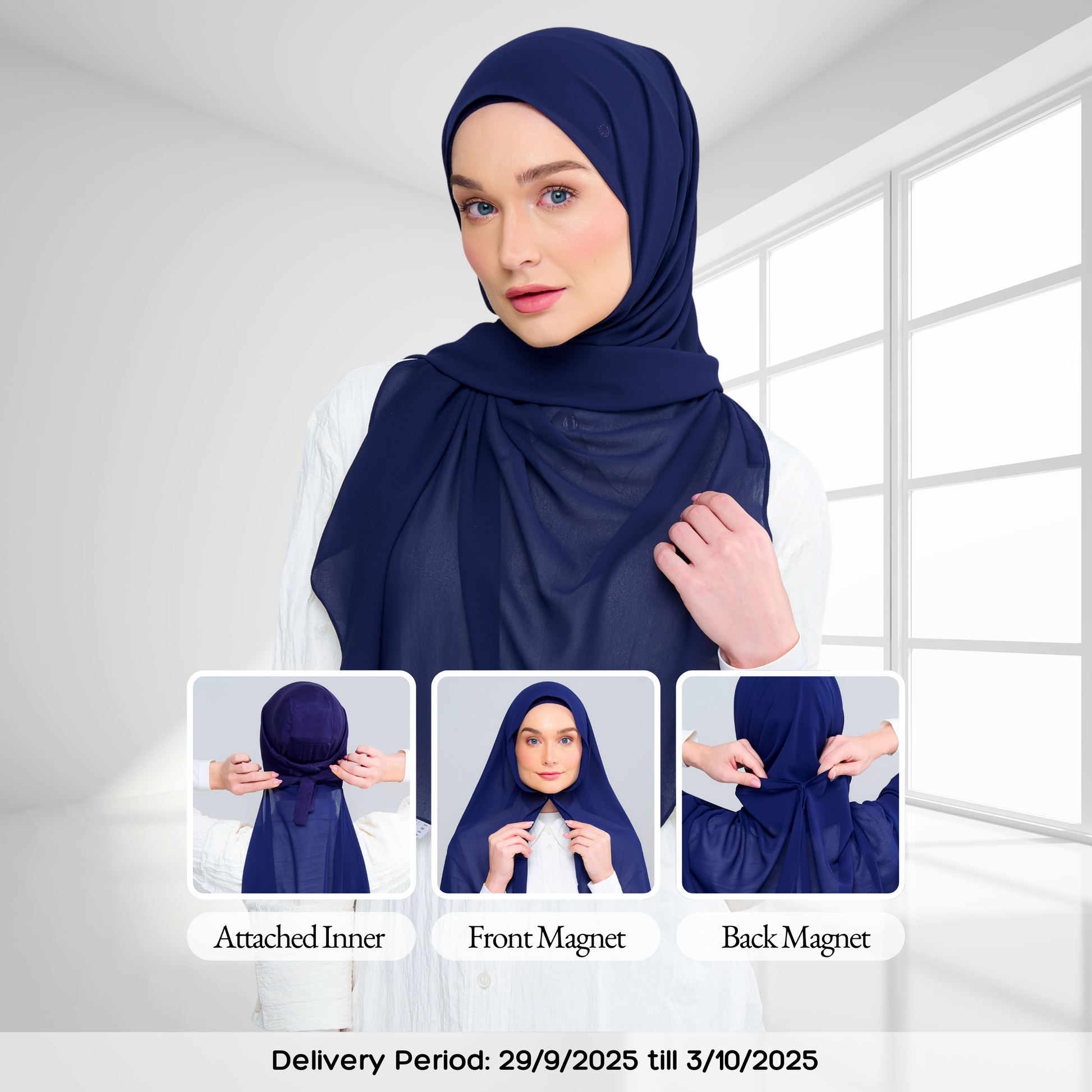 3IN1 Faith features an attached inner to a Full-Curve 1.8 Metre Pearl Chiffon Shawl with Sewn in Front & Back Magnet.