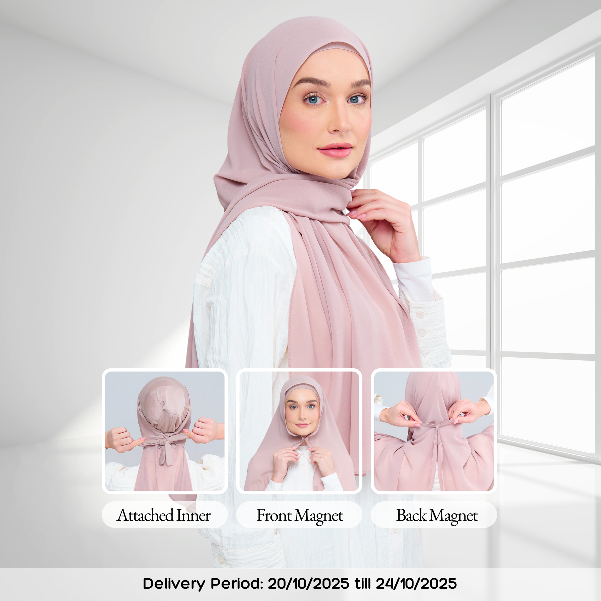 3IN1 Faith features an attached inner to a Full-Curve 1.8 Metre Pearl Chiffon Shawl with Sewn in Front & Back Magnet.