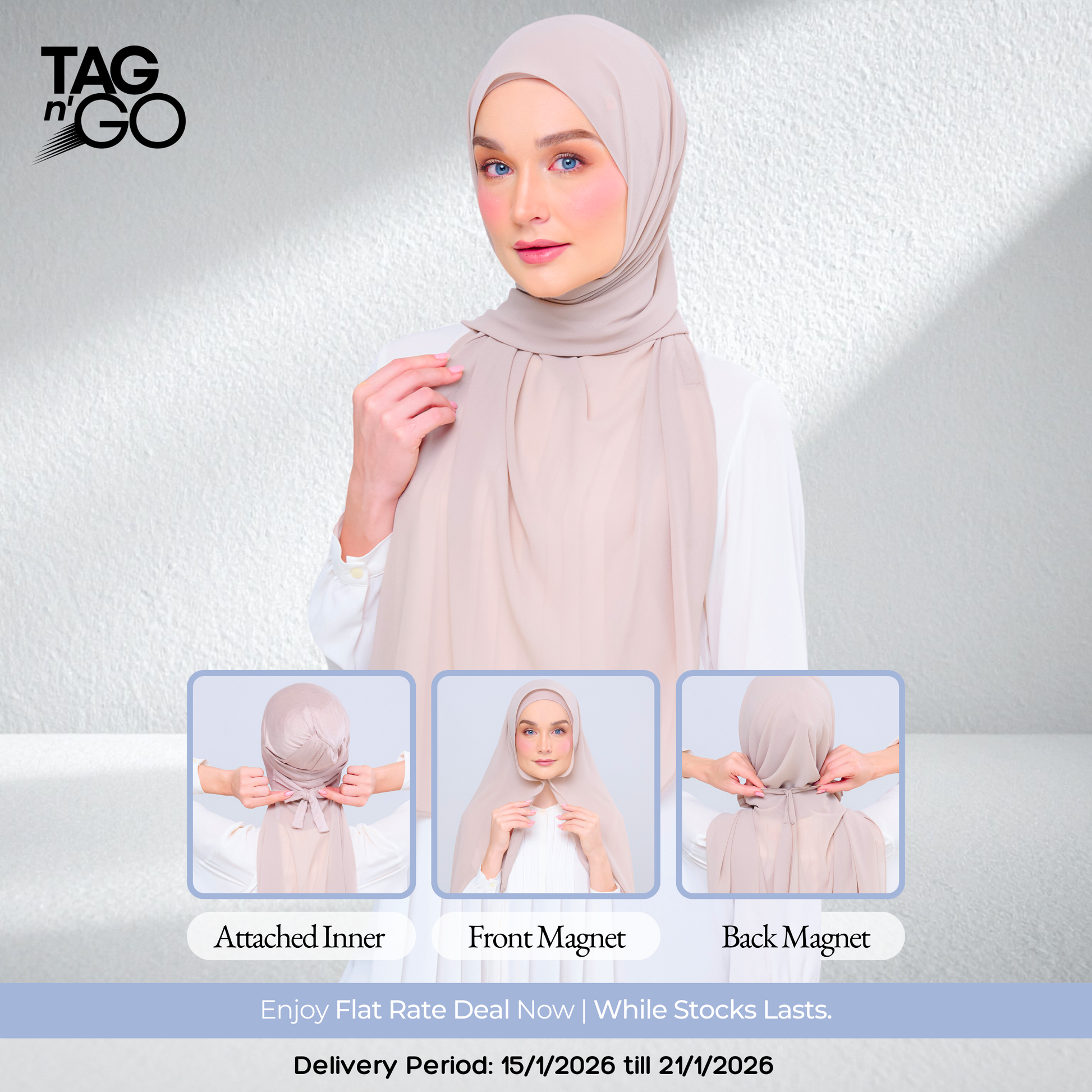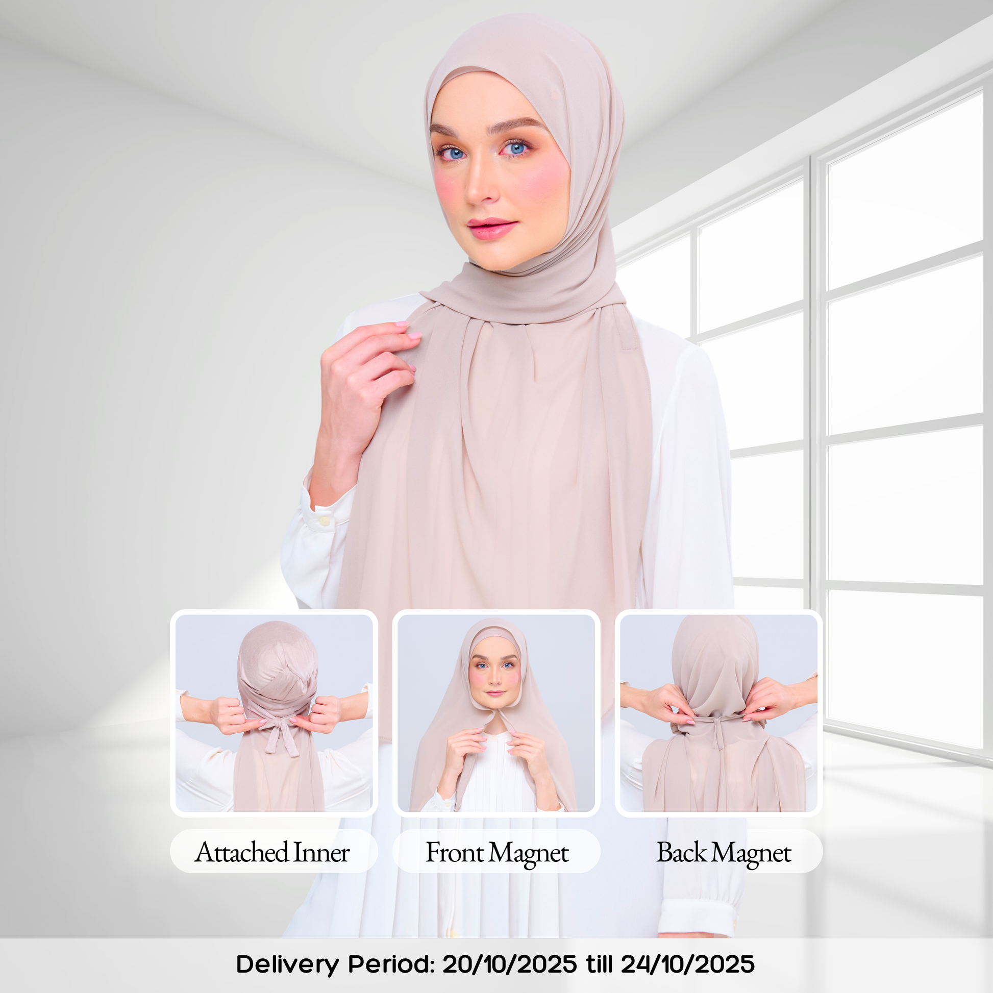 3IN1 Faith features an attached inner to a Full-Curve 1.8 Metre Pearl Chiffon Shawl with Sewn in Front & Back Magnet.
