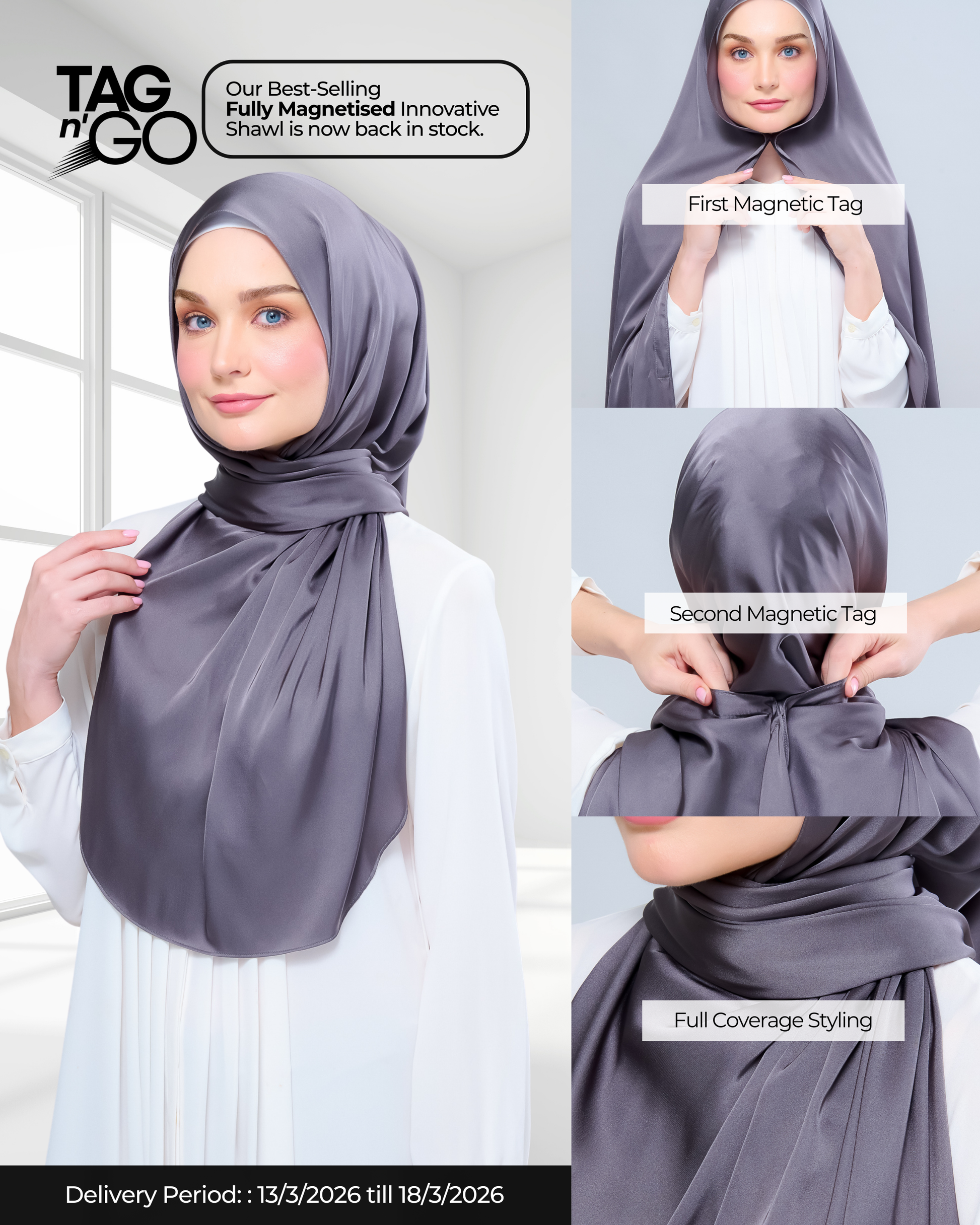 #GoPinless. Save your time for something better and Get Ready in Seconds with our Tag n' Go Collection. Your Favourite Shawl but better! Both Pairs of Magnets are adjustable to your face and body size for Full Coverage Styling.