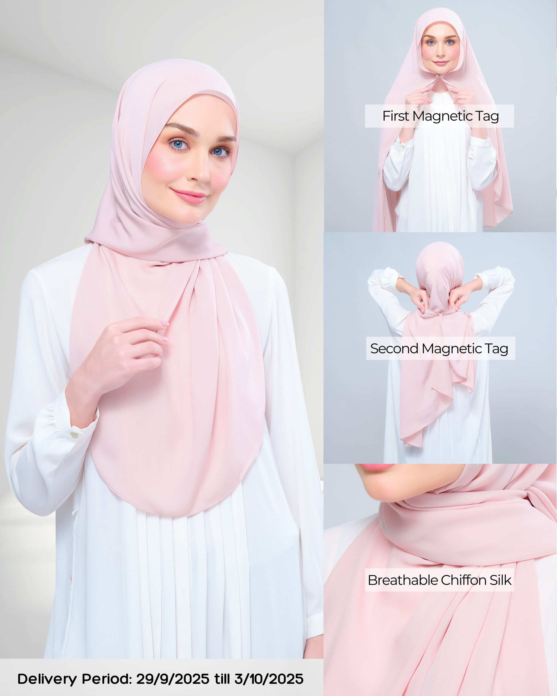 #GoPinless. Save your time for something better and Get Ready in Seconds with our Tag n' Go Collection. Your Favourite Shawl but better! Both Pairs of Magnets are adjustable to your face and body size for Full Coverage Styling.