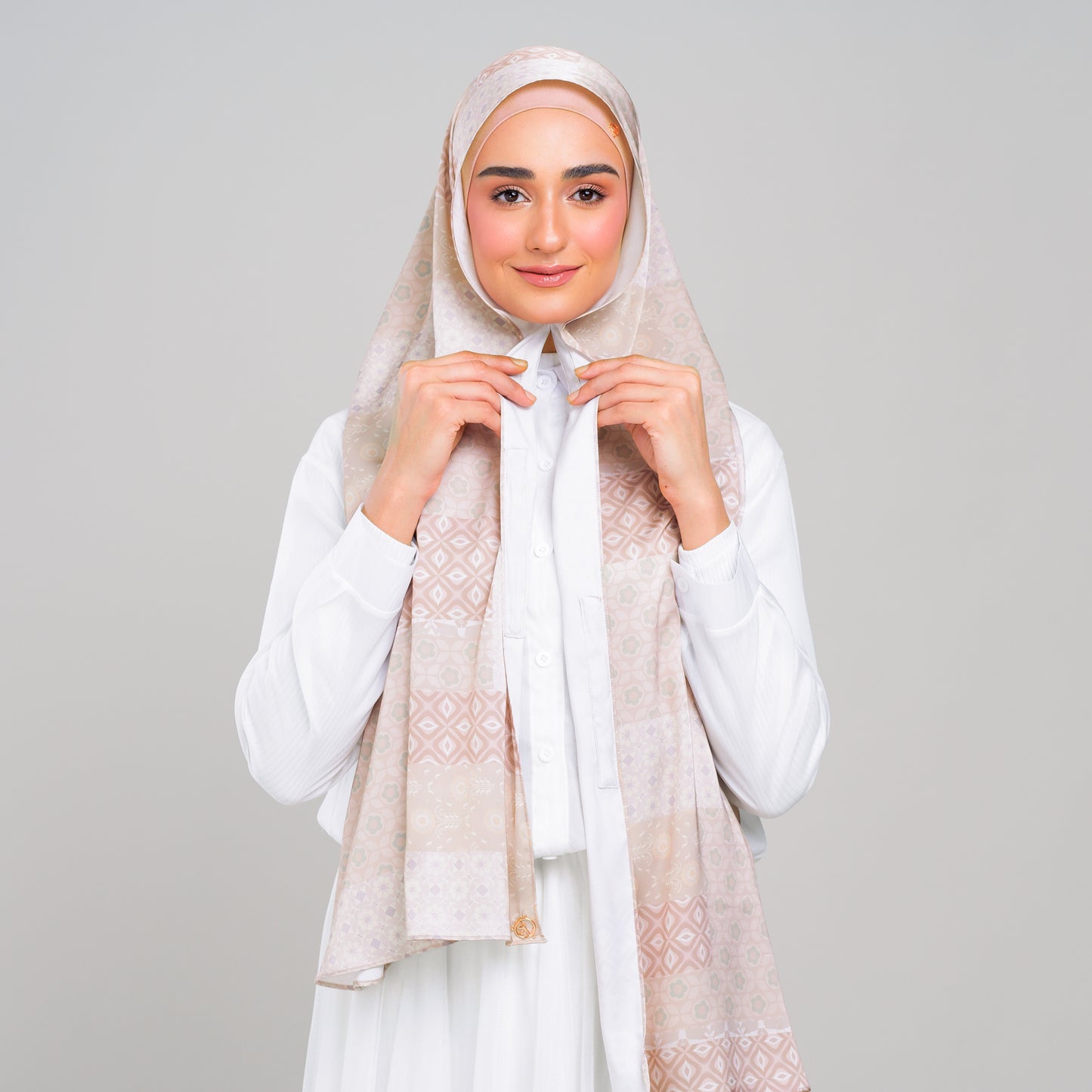 Get ready for your day with Shera Lee's new Printed Tag n' Go Collection! Our printed painted-on Light Satin Silk is luscious and flows elegantly, creating beautiful and sophisticated drapes. It also comes with both pairs of Magnets that are adjustable to your face and body size for Full Coverage Styling! Featuring bold and intricate designs that combine abstract and flower motifs, it is the perfect accessory for your daily outfit. Spoil yourself with choices of 8 other designs under this collection.